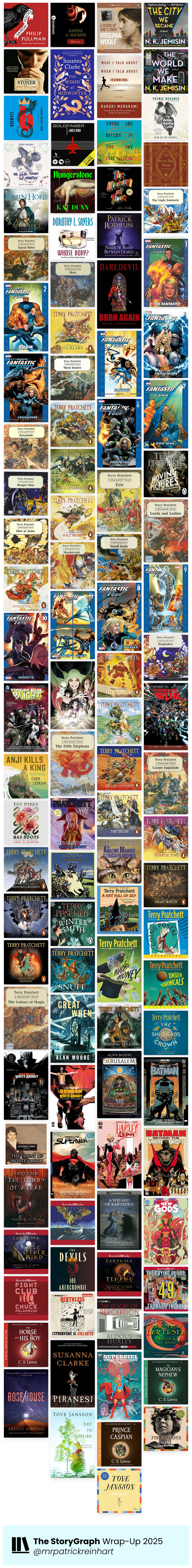 In 2025 I read 107 books. According to StoryGraph, that amounted to 4,721 pages and 795.97 hours listened. Similar to 2024, I read most during the summer, and much less come the end of the year. Odd that; I would've thought I'd be reading more when it's darker and colder and am staying inside. It's not as if I take summers off and spend my days reading by the beach: actually I spent the year working nights in an industrial warehouse listening to audiobooks (and working, too). Or maybe it's because I read more comics and graphic novels.